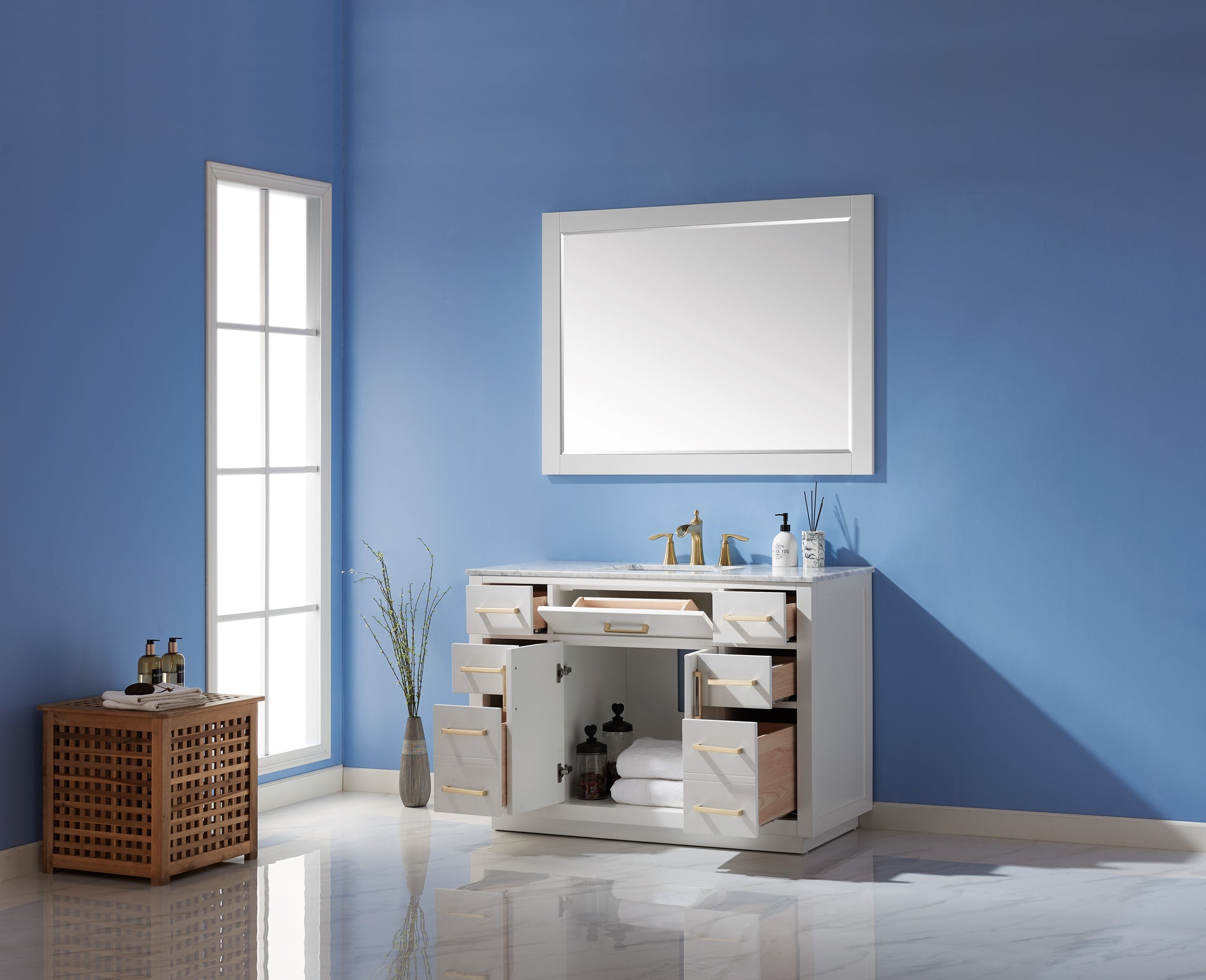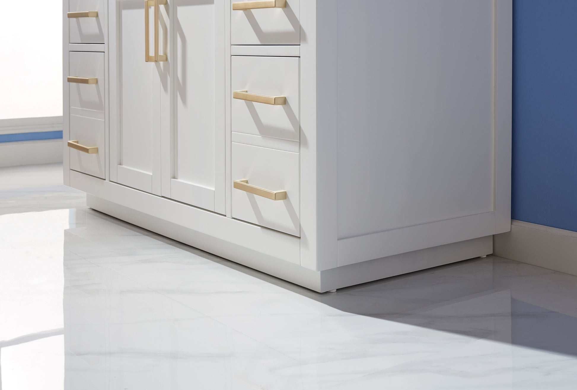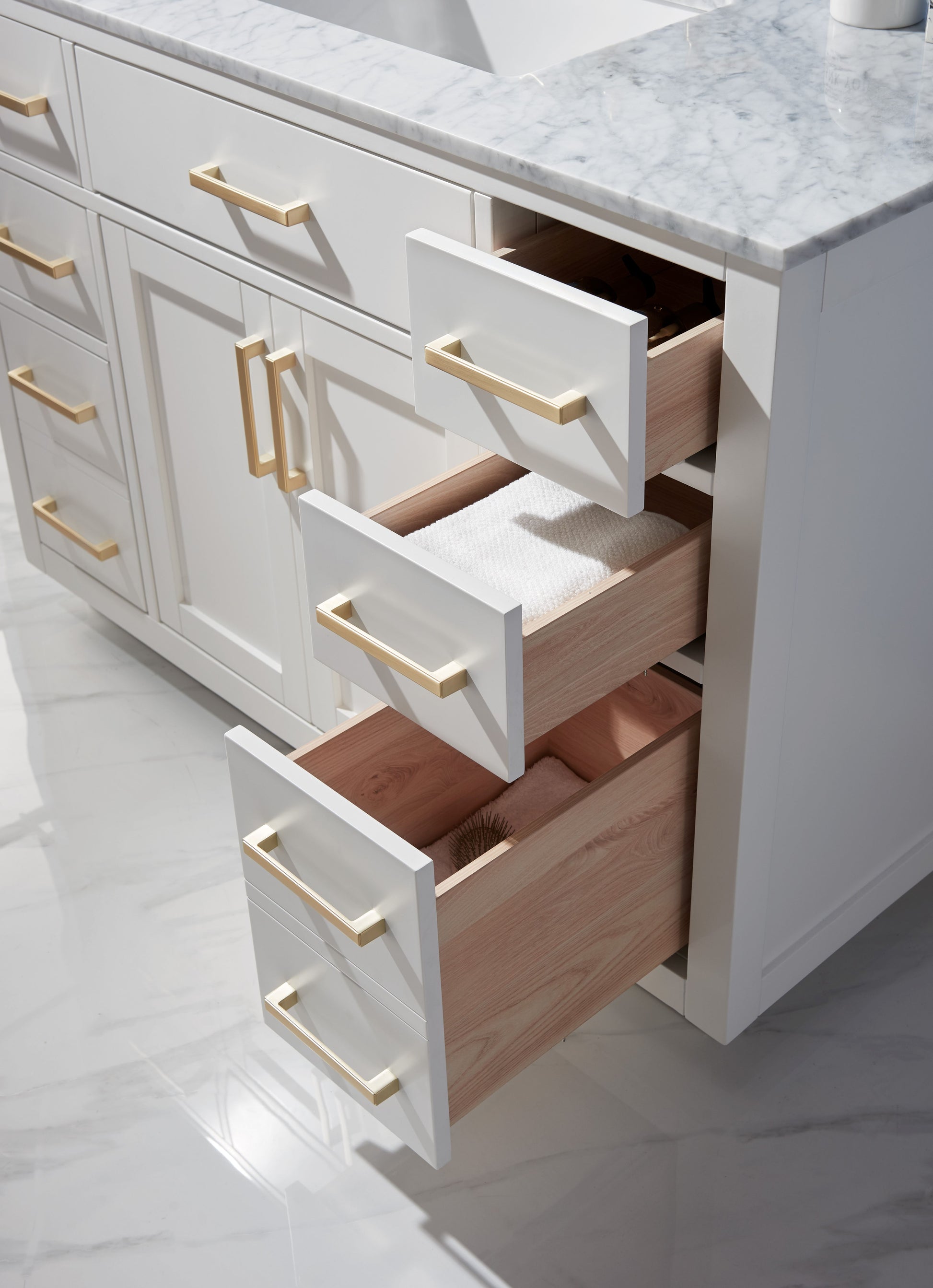 Contemporary white vanity with gold handles and marble countertop. With 6 drawers and white-painted shaker holders, it offers the perfect marriage of practical storage and a sleek, luxurious look that complements any bathroom.