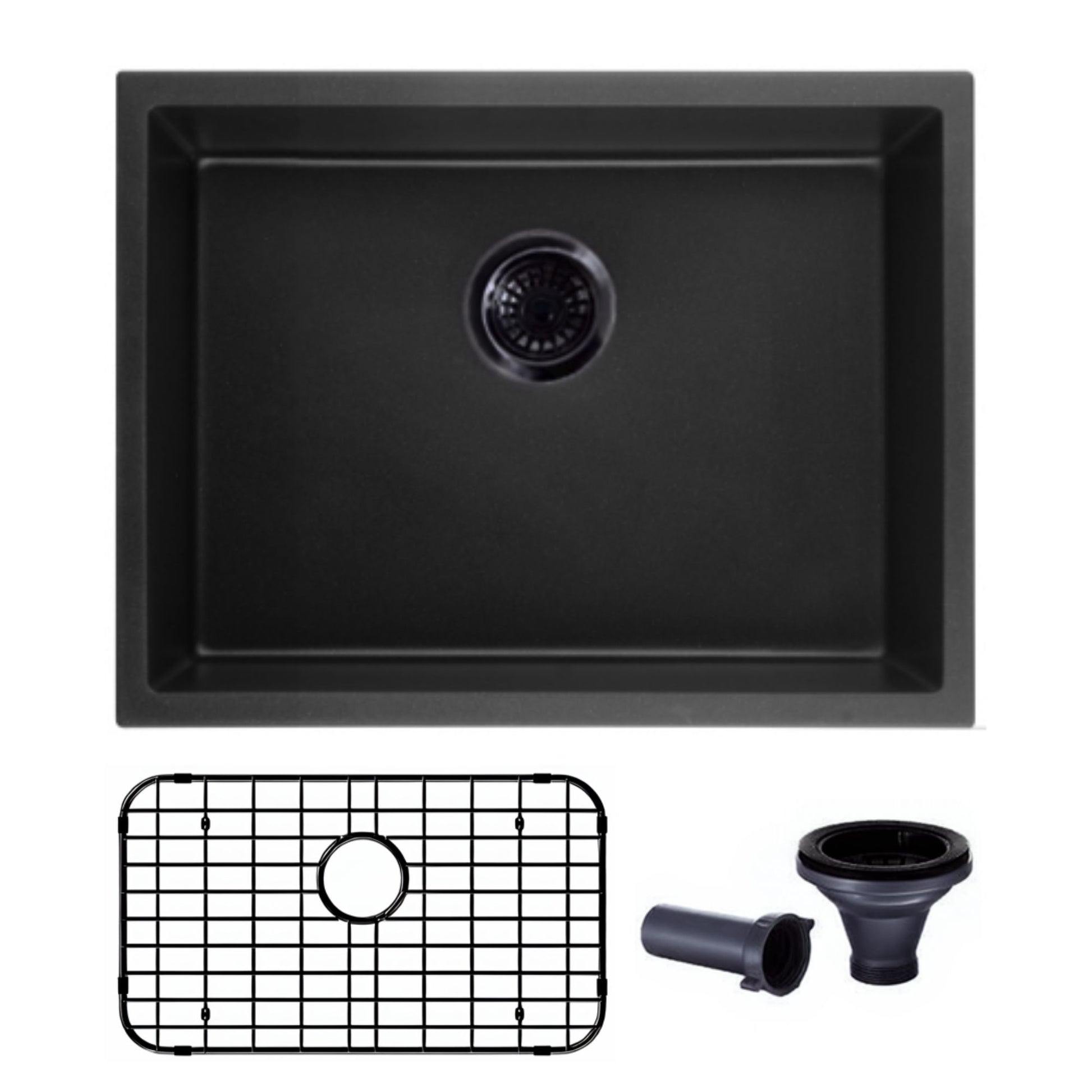 Installez cet évier en quartz de 27x18 pouces en sous-plan ou en montage sur le dessus pour un look moderne.Résistant à la chaleur et aux rayures, cet évier est conçu pour être très durable et facile à nettoyer grâce à ses coins arrondis !Couleur : Noir mat avec des touches de petites paillettes subtiles.Livré avec 1 filtre noir.