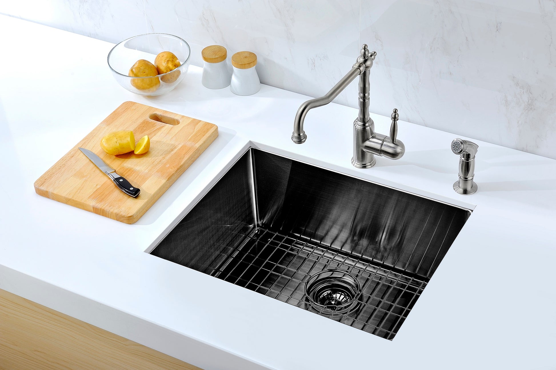 Évier en acier inoxydable noir Nano de 23 po, calibre 16, avec grille