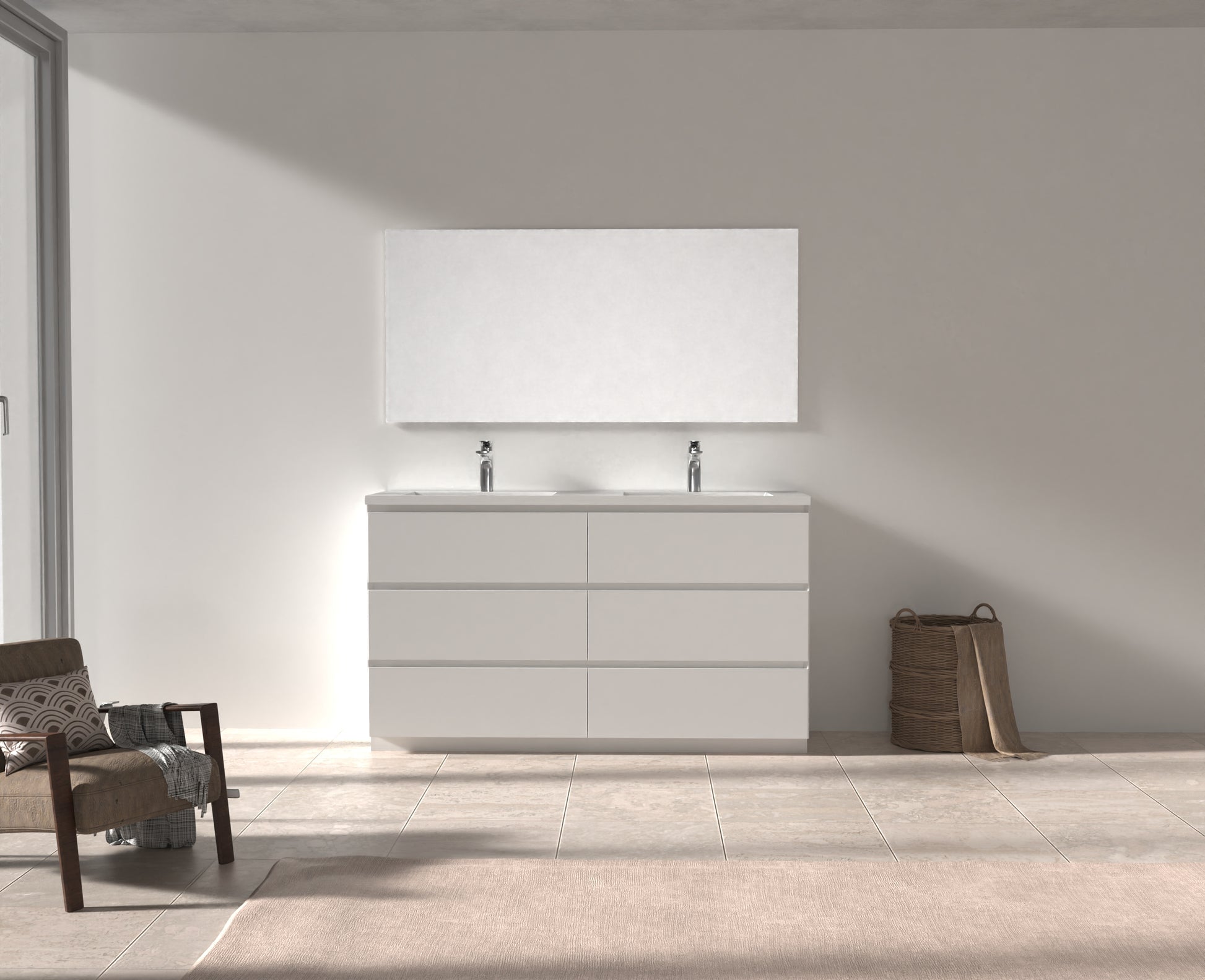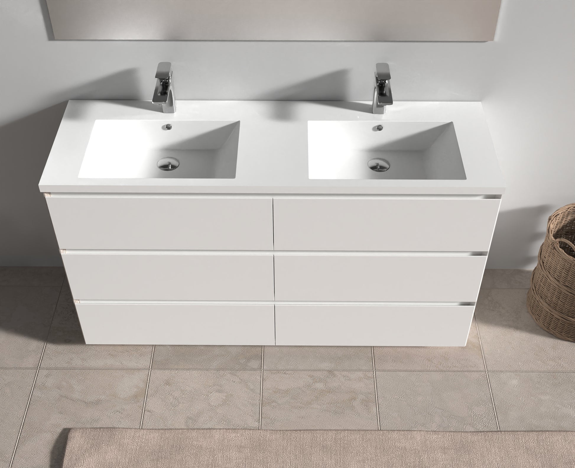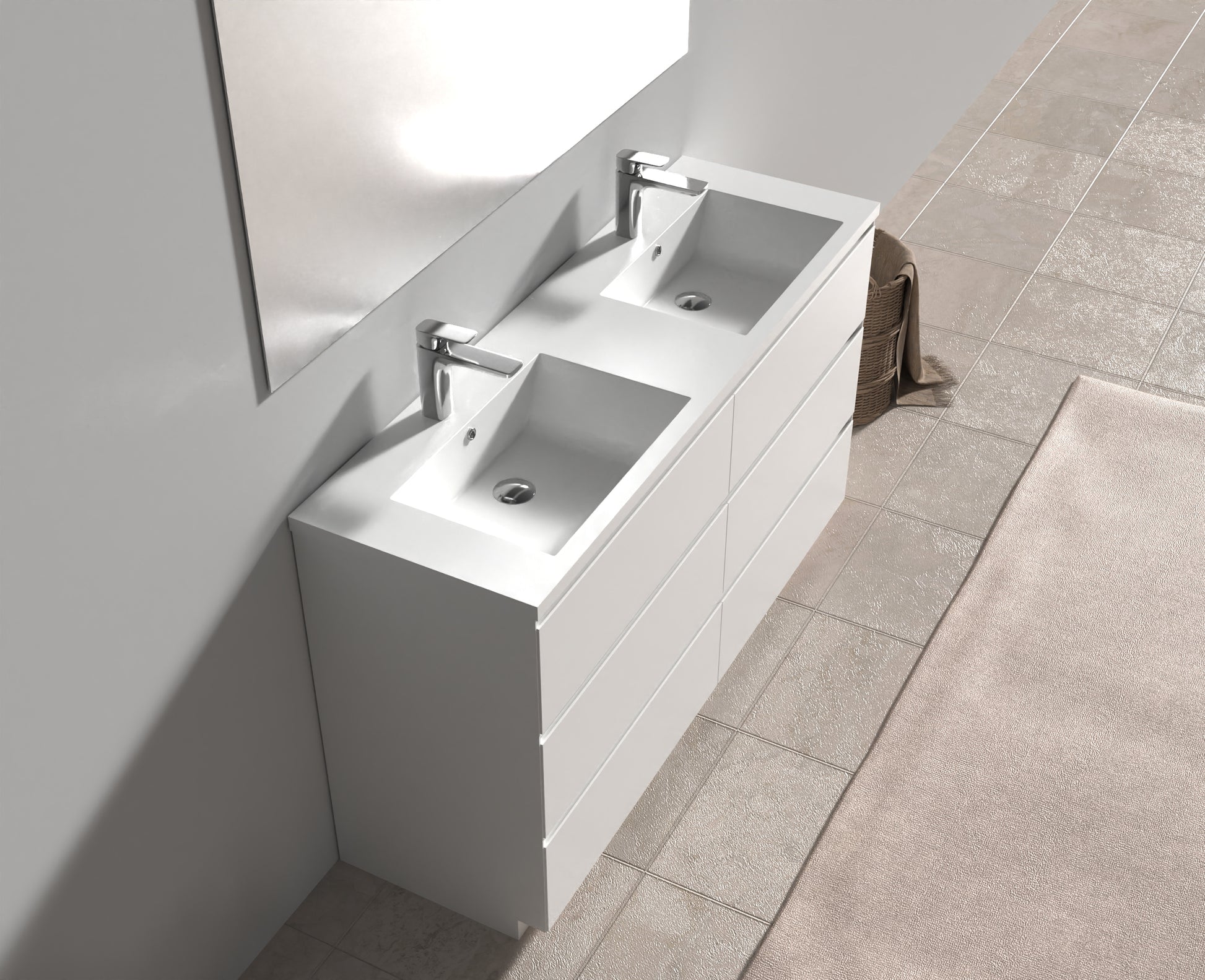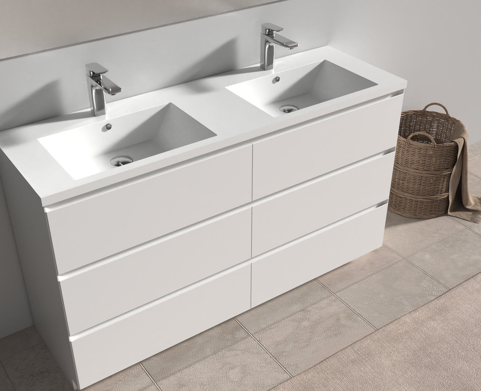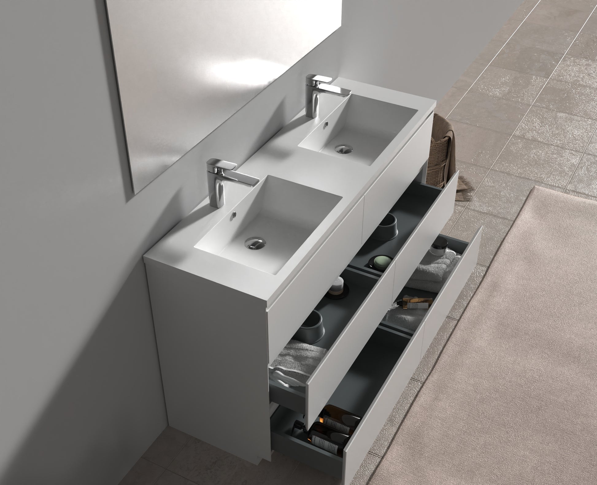 The sensational combination of the ultra White countertop, two basins and White sides, with the natural wood front of the pull-out drawers, sets this contemporary Bain autoportantroom vanity apart.