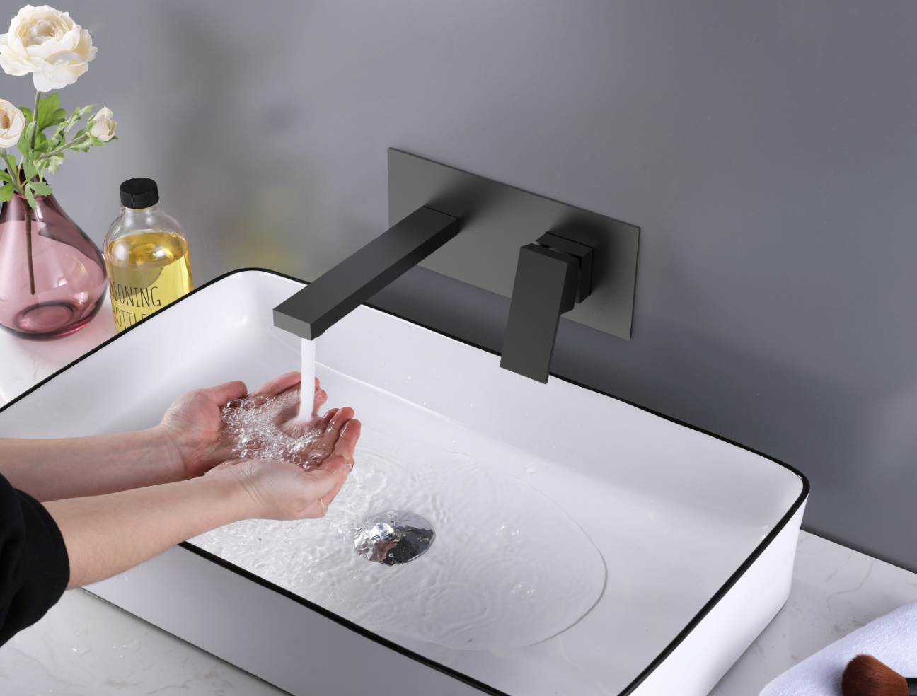 Robinet de salle de bains carré à montage mural Chrome/Noir