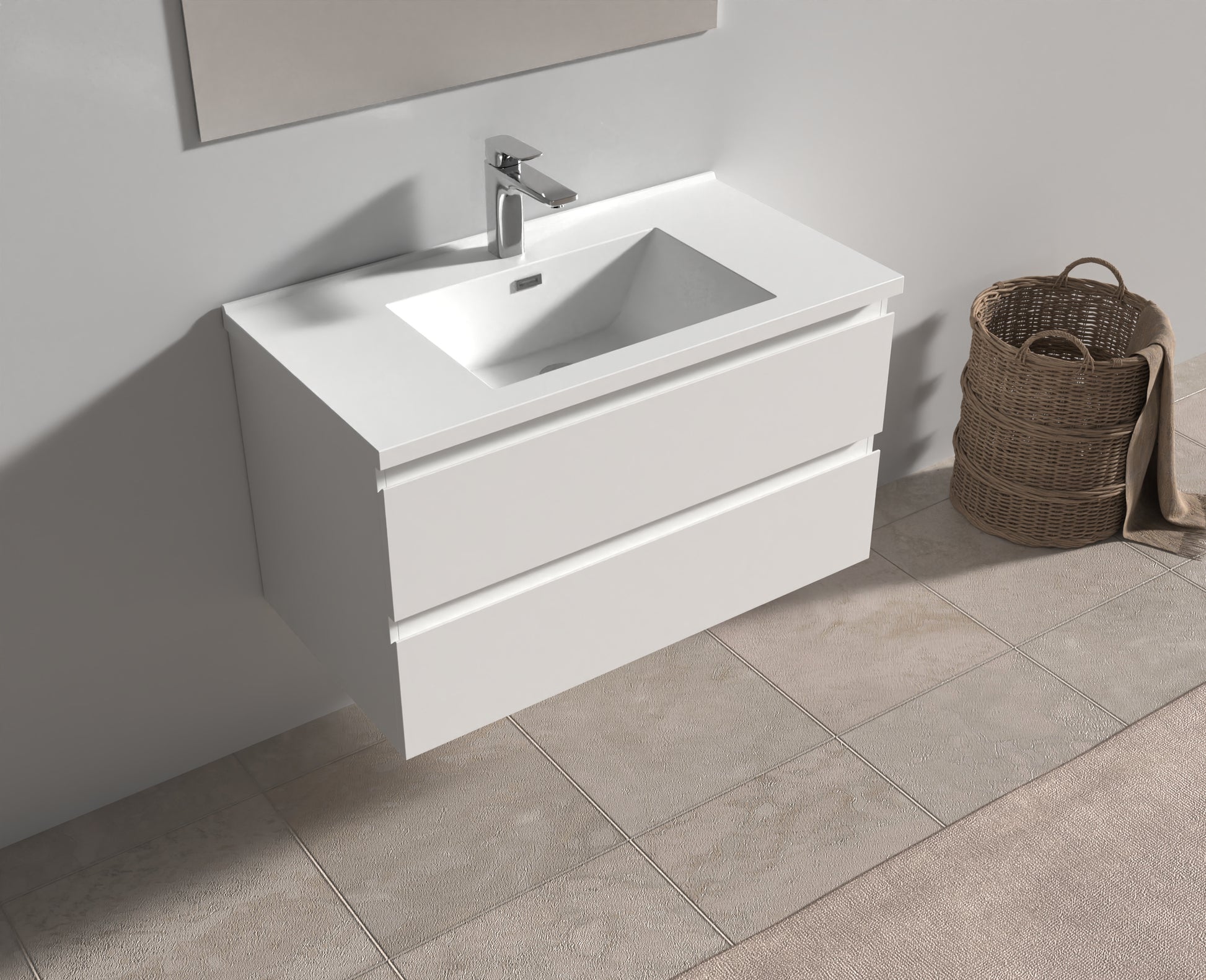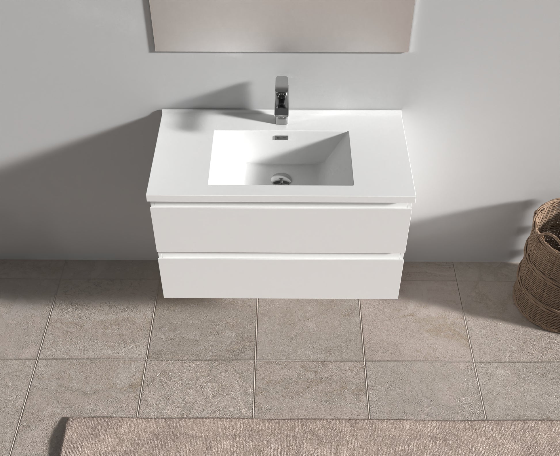 Enhance the ambience of your bathroom with our 91 cm wall-mounted vanity unit, combining modern design and functionality. Designed for a sophisticated look, this vanity is available in two captivating colors: an immaculate Gloss Lacquered White finish, or a contemporary Gray Oak finish that adds a touch of understated elegance. Its sleek design is complemented by two smoothly sliding drawers, offering ample storage space to keep your bathroom essentials organized and within easy reach.