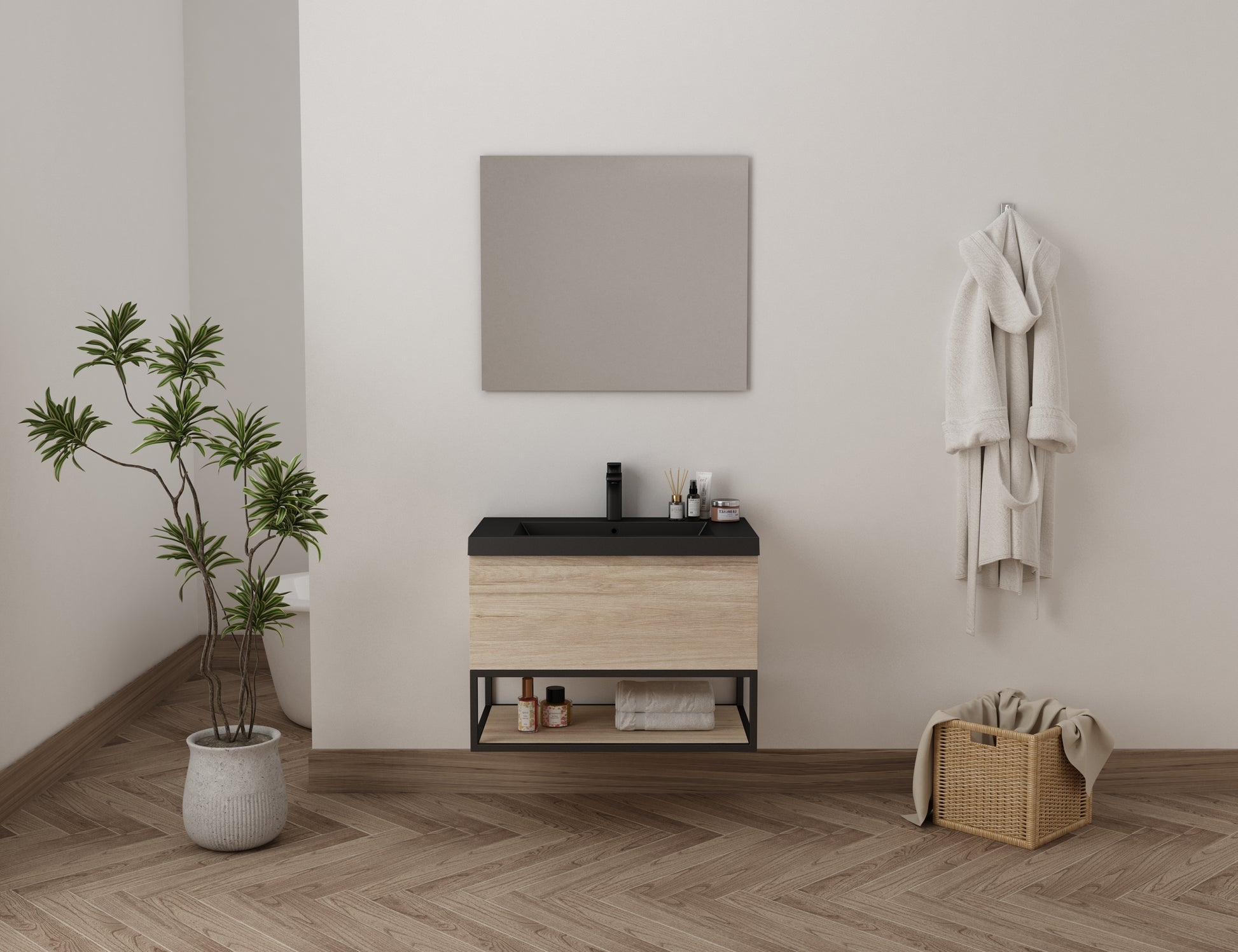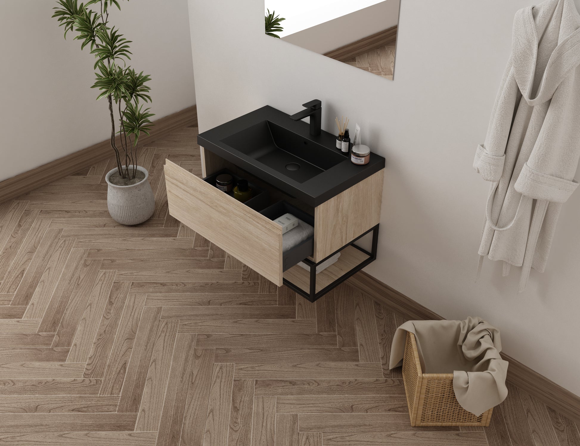 Firenze is a beautiful wall-mounted vanity that boasts a unique design. Featuring Chêne facades and a black frame, it exudes a rustic charm with a modern twist. With one drawer and an open storage space, it provides ample storage for all your bathroom essentials. The combination of Chêne and black adds an elegant touch. Upgrade your bathroom with Firenze and enjoy its practicality and timeless design.
